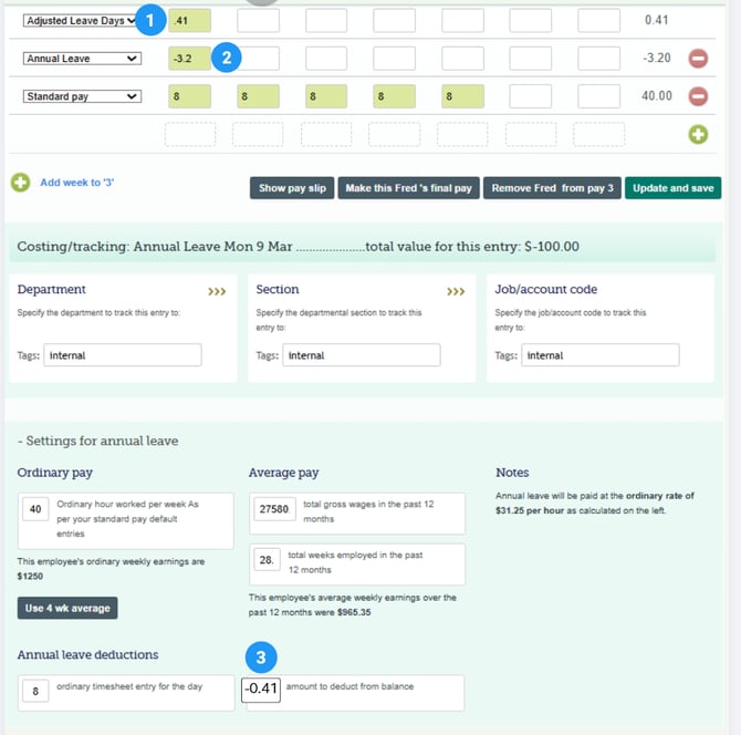 - Check that the amount of annual leave added back to the balance is the original over-deducted amount. (-0.41 days will be deducted)